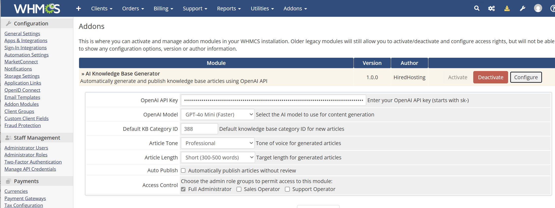 The WHMCS AI K-Base Writer uses AI to automatically generate unique and search engine friendly knowledgebase articles in seconds. Powered by OpenAI GPT-4O-MINI, you will need to enter your API key and fund your Open AI account, however costs are minimal https://platform.openai.com/api-keys